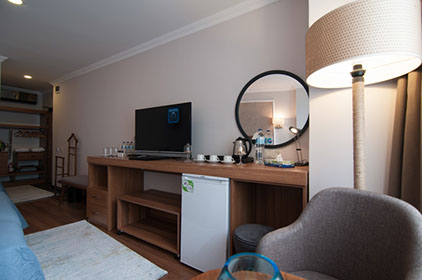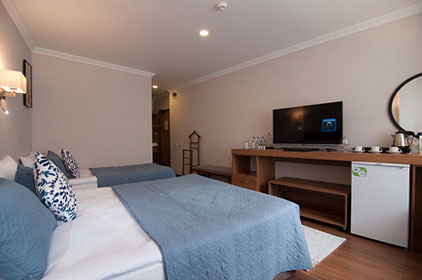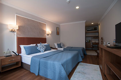 Confort Triple Room This rooms offers side views of the some rooms street and some rooms patio. The bathroom offers a walk-in glass shower with top of the line bath amenities. Room rate includes; - Private check-in and check-out - Free welcome drinks, Turkish delights and desserts - Open-buffet hot and cold breakfast from 08:00 am until 10:00 am - Complimentary patisseries time, coffee, tea and soft drinks from - 24 Hours non-limited hot drinks ñ 25m2